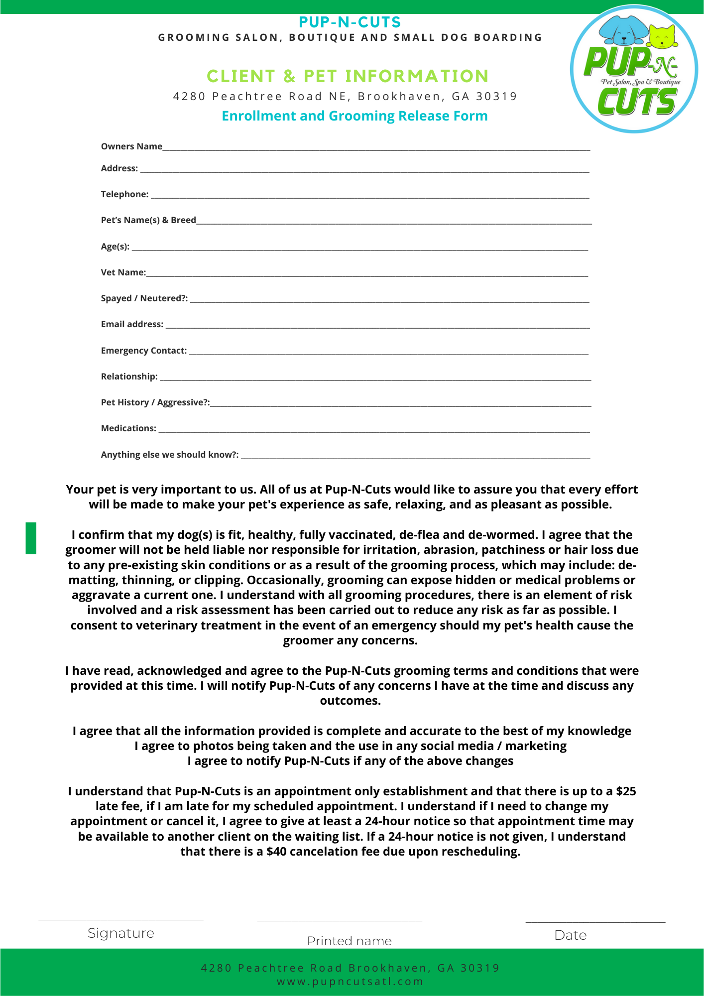 Pup-N-Cuts is a full-service pet salon located in the heart of Brookhaven since 2011. We are staffed with some of the most experienced groomers in Atlanta, all with at least eight years of experience and pride ourselves with the knowledge of gentle handling. We offer state of the art bathing, using the HYDRO SURGE PRO BATHING system 5.1 for a cleaner and healthier skin and coat. We are appointment only, but do offer walk-in availability for nail, ear and external gland expression services.